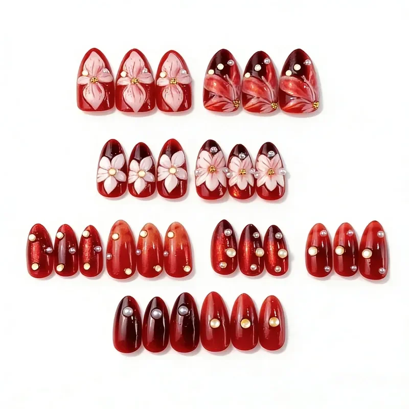 30 Pièces de Faux Ongles Courts Faits Main en Forme d'Amande Design Fleur 3D Ongles Artificiels avec Diamants